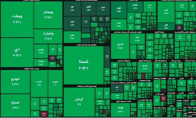 ۶۱ درصد نمادهای بورسی مثبت و ۳۹ درصد آنها منفی بودند که از میان آنها بانک ملت و ایران خودرو نسبت به سایر نمادها بیشترین تاثیر مثبت و در مقابل معدنی و صنعتی چادرملو نسبت به سایر نمادها بیشترین تاثیر منفی را روی بورس گذاشتند.