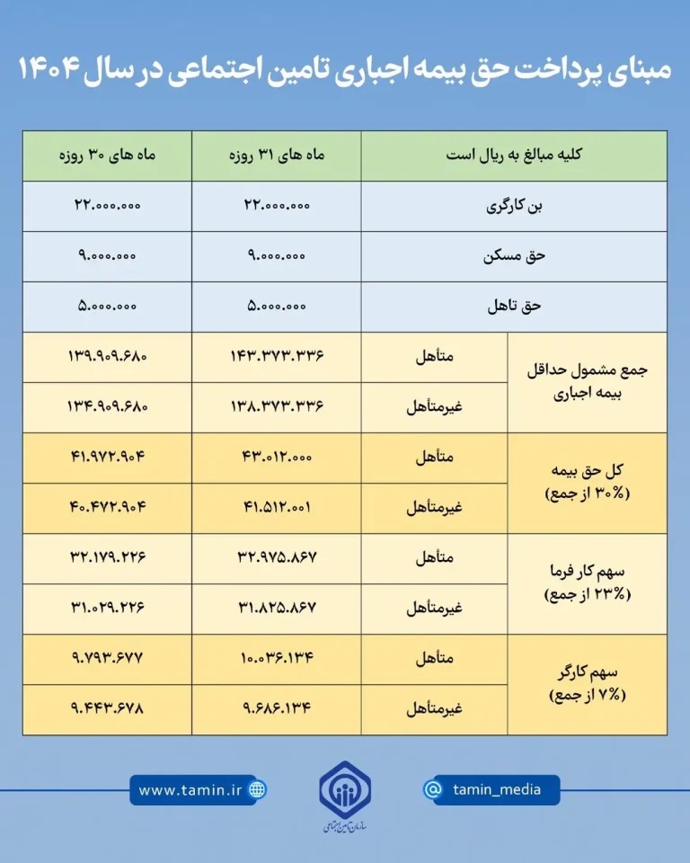 سهم حق بیمه کارگران و کارفرمایان در سال 1404