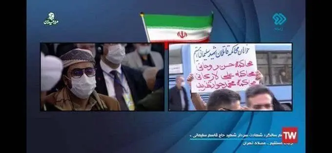 در پخش زنده مراسم سالگرد شهادت حاج قاسم سلیمانی از رسانه ملی، پلاکاردی حاوی درخواست محاکمه روحانی، لاریجانی و ظریف پخش شد.