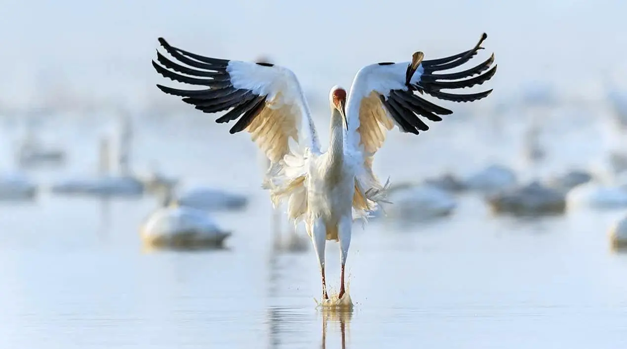 درنای سفید «امید»، تنها بازمانده گله غربی درناهای سیبری صبح امروز به تالاب فریدونکنار وارد شد.