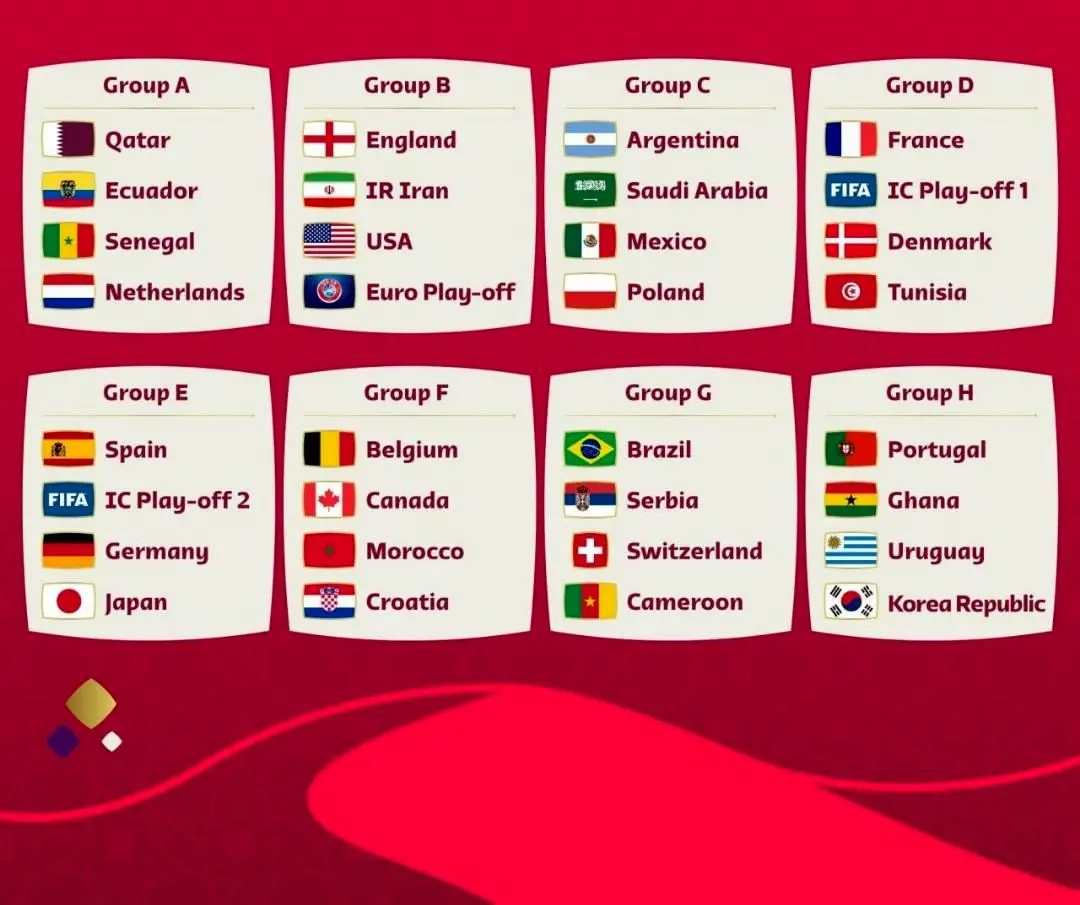 ۳۲ تیم راه یافته به جام جهانی ۲۰۲۲، در هشت گروه چهار تیمی دسته بندی می شوند. تیم های صعودکننده به جام جهانی قطر به این شرح است: